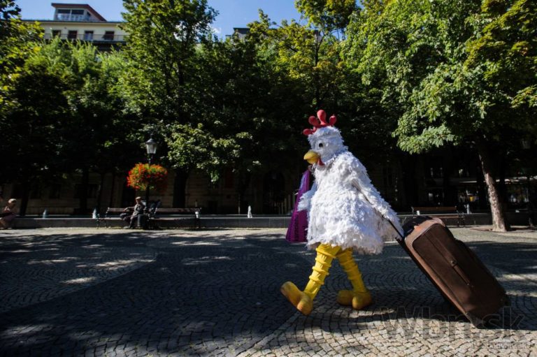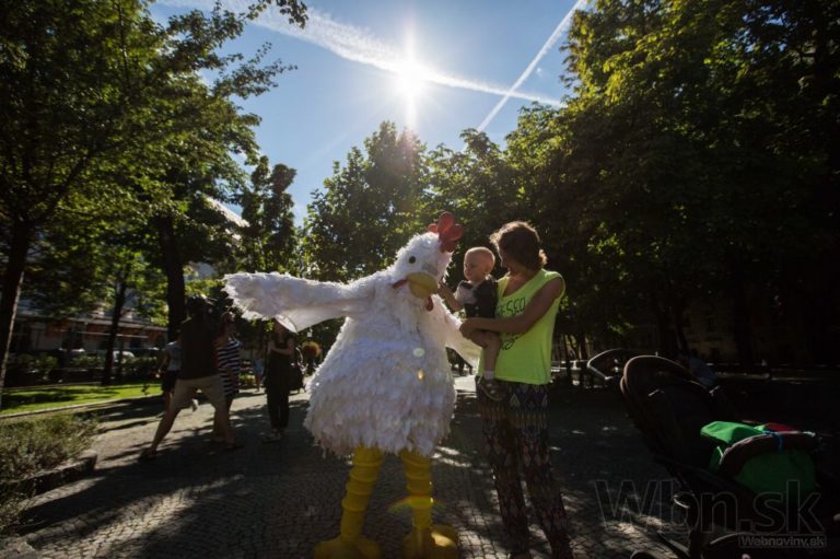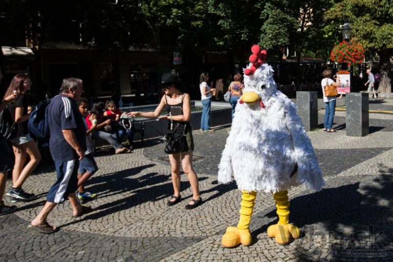 Kurča Rosa v uliciach Bratislavy počas putovania po štátoch Európskej únie. (18. august 2014) Foto: SITA/AP