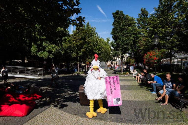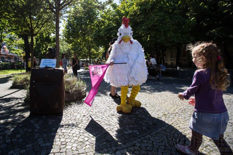 Kurča Rosa v uliciach Bratislavy počas putovania po štátoch Európskej únie. (18. august 2014) Foto: Facebook/39Days4Rosa
