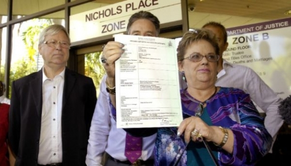 Matka uneseného dievčatka Lindy Chamberlain-Creighton ukazuje novinárom certifikát potvrdzujúci smrť jej dcéry pred súdom v Darwine. Foto: edition.cnn.com