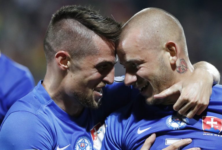 Vladimír Weiss sa so spoluhráčom Róbertom Makom teší zo svojho gólu v sieti Litvy zápasu F-skupiny európskej časti kvalifikácie o postup na MS 2018. Vilnius, 10. jún 2017. Foto: SITA/AP.
