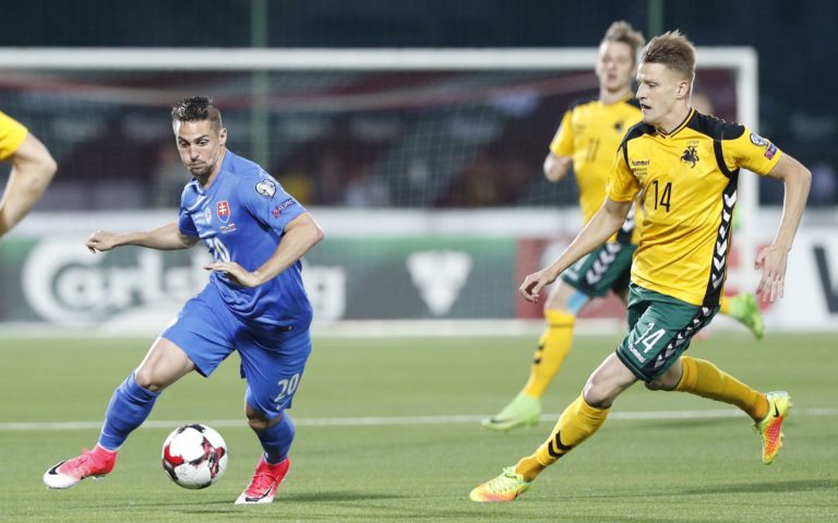 Litovský reprezentant Vykintas Slivka bráni Slováka Róberta Maka počas zápasu F-skupiny európskej časti kvalifikácie o postup na MS 2018. Vilnius, 10. jún 2017. Foto: SITA/AP.