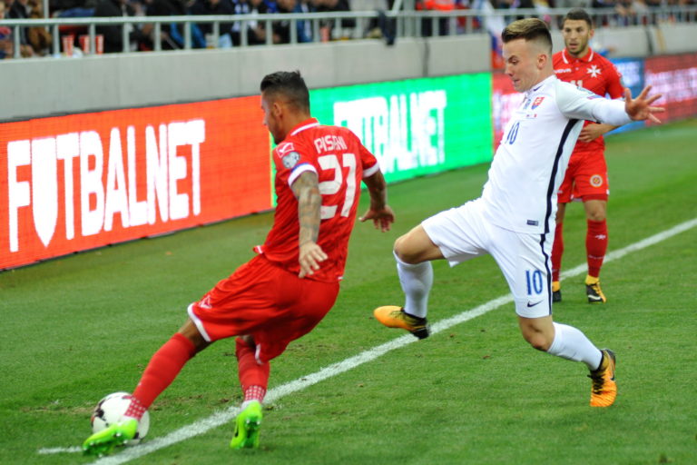 Sprava: Albert Rusnák (Slovensko) a Stephen Pisani (Malta) počas futbalového zápasu Slovensko - Malta v rámci F-skupiny európskej časti kvalifikácie o postup na MS 2018 do Ruska. Trnava, 8. október 2017. Foto: SITA/Ivan Kopčáni.
