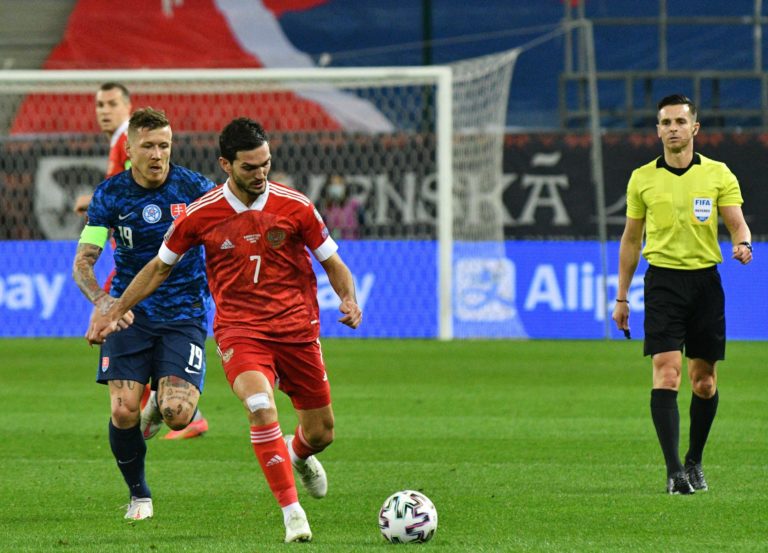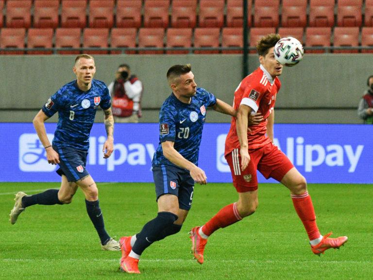 Zľava: Magomed Ozdojev z Ruska, Jakub Hromada zo Slovenska a Rifat emaletdinov z Ruska počas futbalového zápasu európskej časti H-skupiny kvalifikácie o postup na MS 2022 medzi Slovensko - Rusko. Trnava, 30. marec 2021. Foto: SITA/Martin Medňanský
