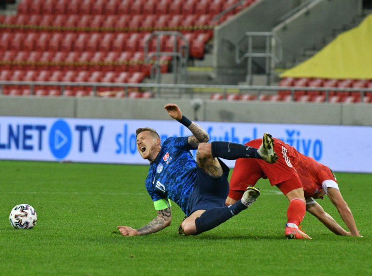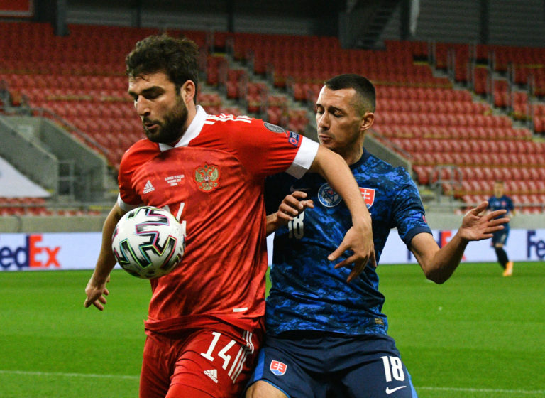 Zľava: Juraj Kucka zo Slovenska a Magomed Ozdoje z Ruska počas futbalového zápasu európskej časti H-skupiny kvalifikácie o postup na MS 2022 medzi Slovensko - Rusko. Trnava, 30. marec 2021. Foto: SITA/Martin Medňanský