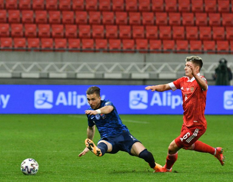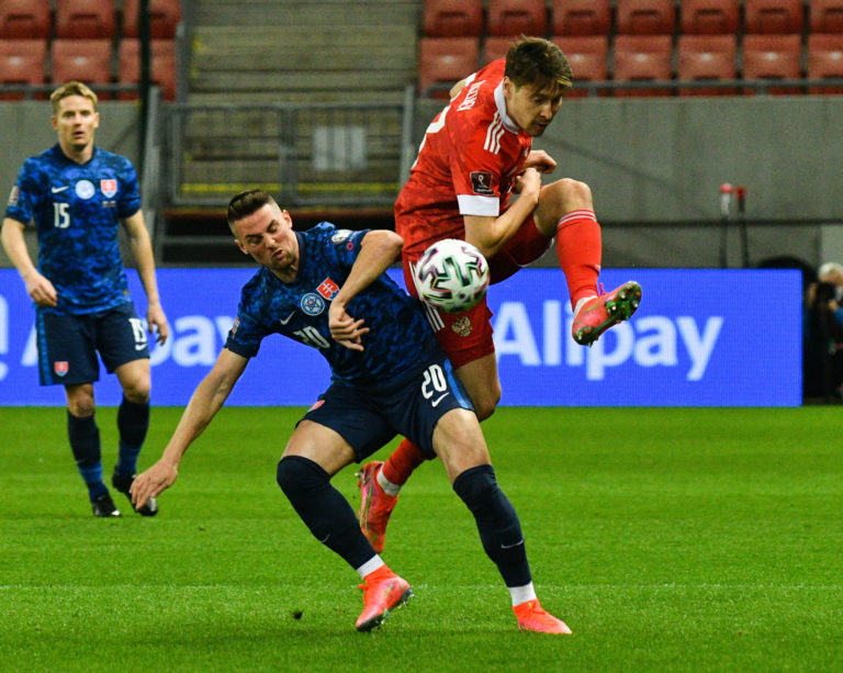Zľava: Jakub Hromada zo Slovenska a Daler Kuzjajev z Ruska počas futbalového zápasu európskej časti H-skupiny kvalifikácie o postup na MS 2022 medzi Slovensko - Rusko. Trnava, 30. marec 2021. Foto: SITA/Martin Medňanský