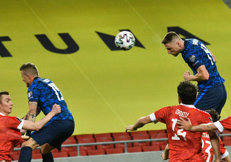 Milan Škriniar zo Slovenska (vpravo) dáva gól počas futbalového zápasu európskej časti H-skupiny kvalifikácie o postup na MS 2022 medzi Slovensko - Rusko. Trnava, 30. marec 2021. Foto: SITA/Martin Medňanský