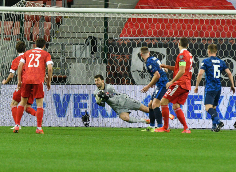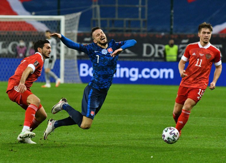 Brankár Dušan Kuciak zo Slovenska (druhý zľava) počas futbalového zápasu európskej časti H-skupiny kvalifikácie o postup na MS 2022 medzi Slovensko - Rusko. Trnava, 30. marec 2021. Foto: SITA/Martin Medňanský