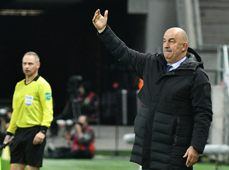 Tréner ruskej futbalovej reprezentácie Stanislav Čerčesov (vpravo) počas futbalového zápasu európskej časti H-skupiny kvalifikácie o postup na MS 2022 medzi Slovensko - Rusko. Trnava, 30. marec 2021. Foto: SITA/Martin Medňanský