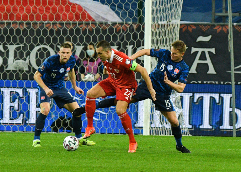 Sprava: Juraj Kucka zo Slovenska a Andrej Mostovoj z Ruska počas futbalového zápasu európskej časti H-skupiny kvalifikácie o postup na MS 2022 medzi Slovensko - Rusko. Trnava, 30. marec 2021. Foto: SITA/Martin Medňanský