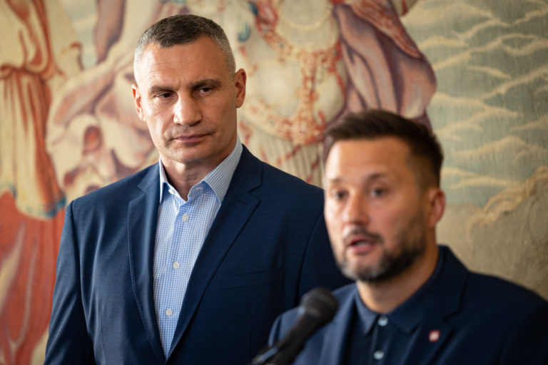 Zľava: Primátor Bratislavy Matúš Vallo a starosta ukrajinského hlavného mesta Kyjev Vitalij Kličko počas návštevy starostu ukrajinského hlavného mesta Kyjev Vitalija Klička v Bratislave. Bratislava, 18. júl 2023. Foto: SITA/Jana Birošová