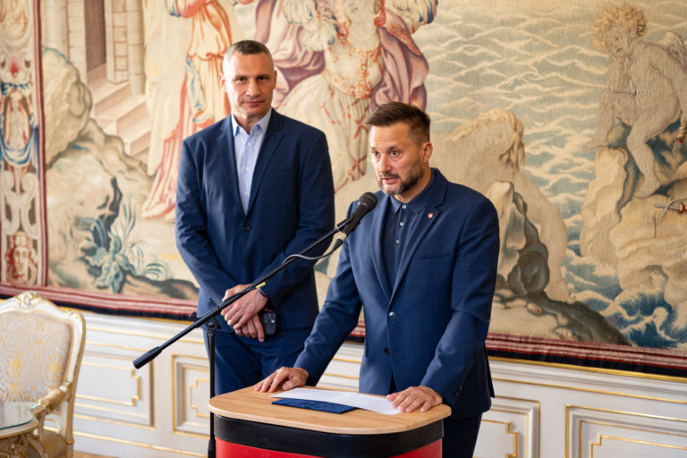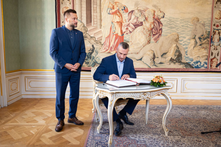 Zľava: Primátor Bratislavy Matúš Vallo a starosta ukrajinského hlavného mesta Kyjev Vitalij Kličko v Primaciálnom paláci počas návštevy starostu ukrajinského hlavného mesta Kyjev Vitalija Klička v Bratislave. Bratislava, 18. júl 2023. Foto: SITA/Jana Birošová