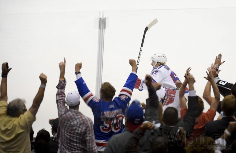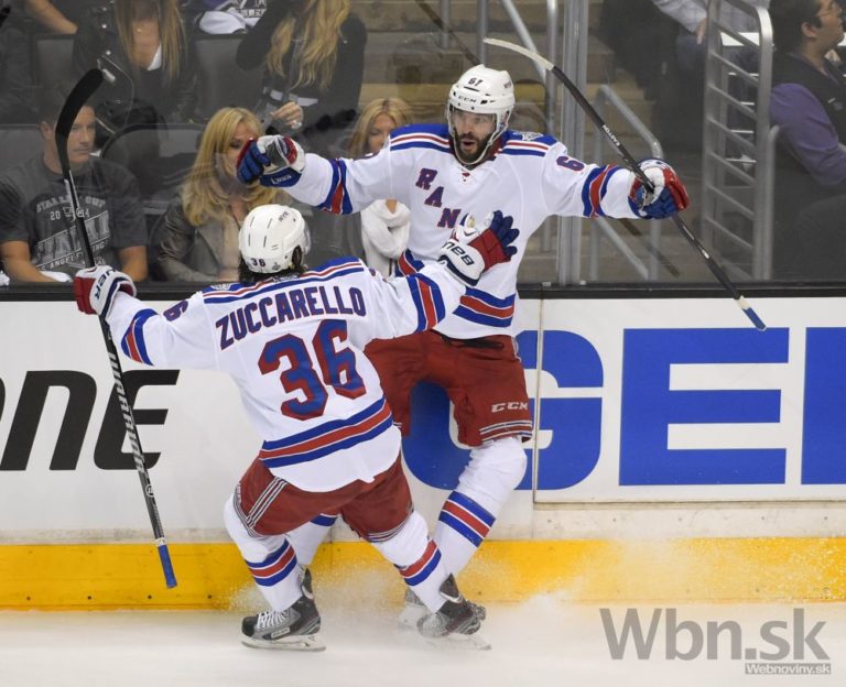 Ľavé krídlo New York Rangers Carl Hagelin oslavuje svoj gól v zápase proti Los Angeles Kings. Foto: SITA/AP
