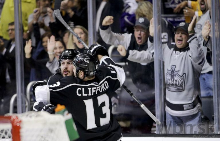 Obranca Los Angeles Kings Drew Doughty, zľava, oslavuje svoj gól s ľavým krídelníkom Kyleom Cliffordom. Foto: SITA/AP