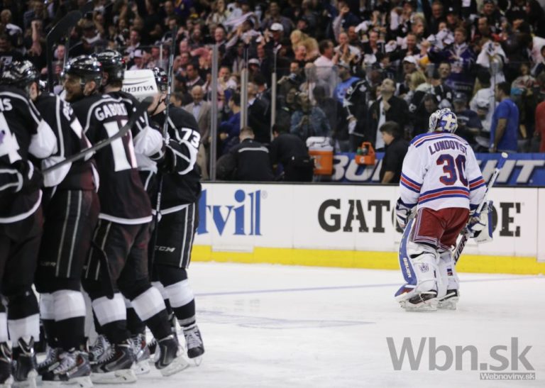 Hráči Los Angeles Kings oslavujú víťazný gól, v pozadí z ľadu odchádza brankár New York Rangers Henrik Lundqvist. Foto: SITA/AP