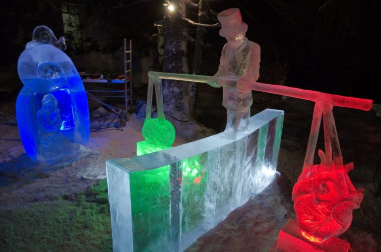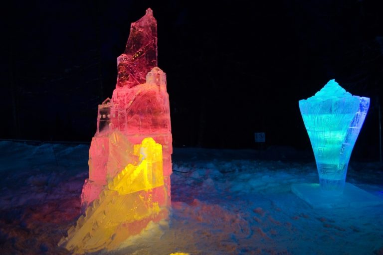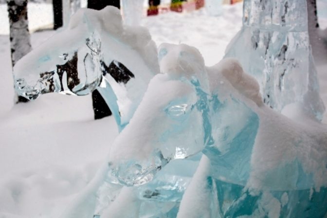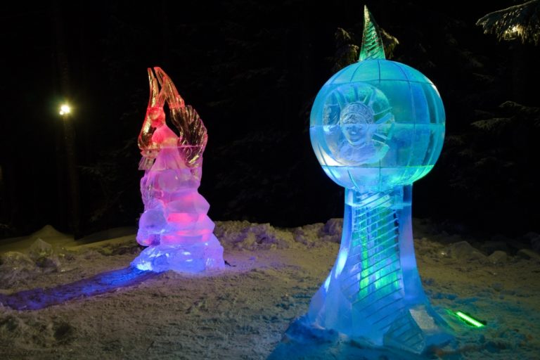Sochy z ľadu slovenského tímu počas piatych neoficiálnych majstrovstiev sveta v tesaní ľadových sôch Tatry Ice Master 2017 na Hrebienku. Vysoké Tatry, 14. január 2017. Foto: SITA/Radoslav Maťaš