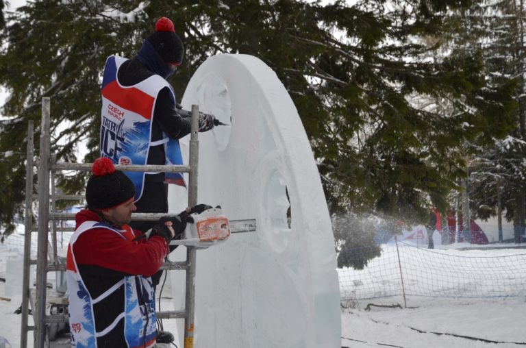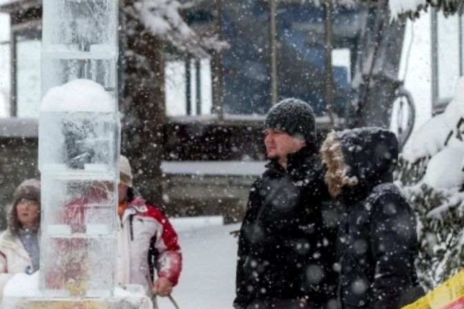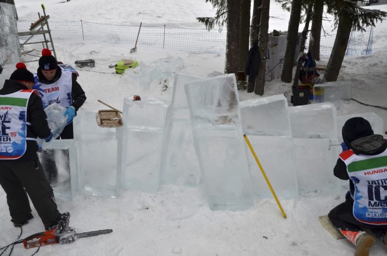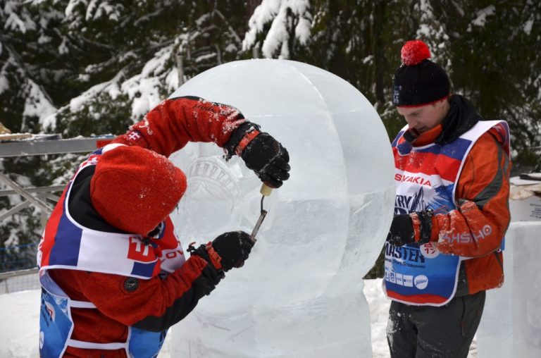 Súťažiaci zo Slovenska pri tesaní sochy z ľadu počas piatych neoficiálnych majstrovstiev sveta v tesaní ľadových sôch Tatry Ice Master 2017 na Hrebienku. Vysoké Tatry, 13. január 2017. Foto: SITA/Radoslav Maťaš