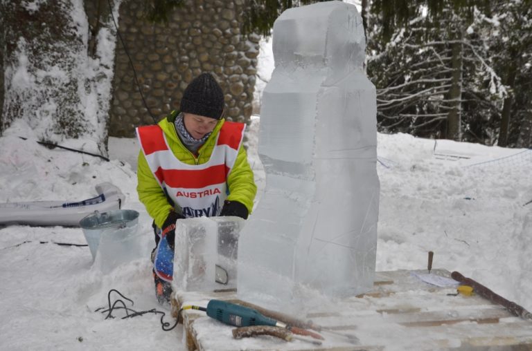Súťažiaca z Rakúska pri tesaní sochy z ľadu počas piatych neoficiálnych majstrovstiev sveta v tesaní ľadových sôch Tatry Ice Master 2017 na Hrebienku. Vysoké Tatry, 13. január 2017. Foto: SITA/Radoslav Maťaš