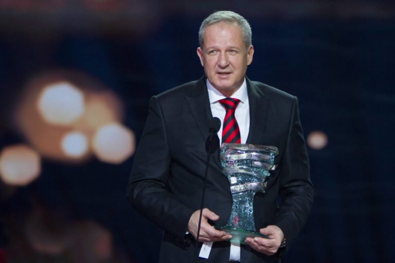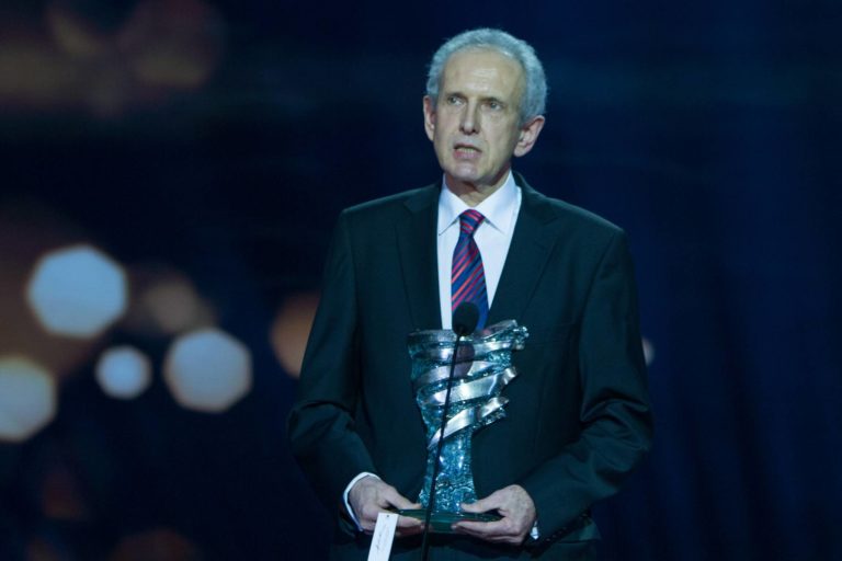 Za laureáta ceny Krištáľové krídlo v kategórii Šport Petra Hámora prevzal cenu prezident Slovenského olympijského výboru (SOV) Anton Siekel (vľavo) počas 21. ročníka oceňovania najvýznamnejších osobností Slovenska za rok 2017 Krištáľové krídlo Foto: SITA/Ľudovít Vaniher