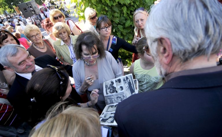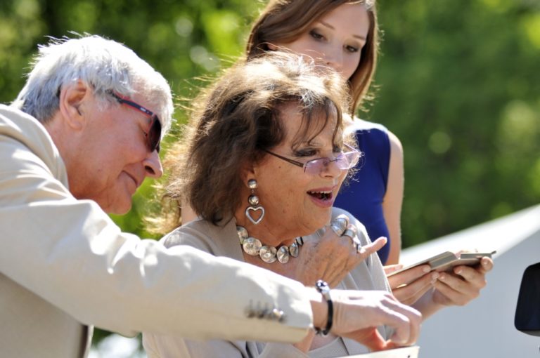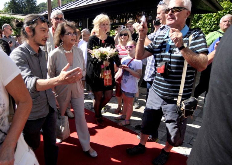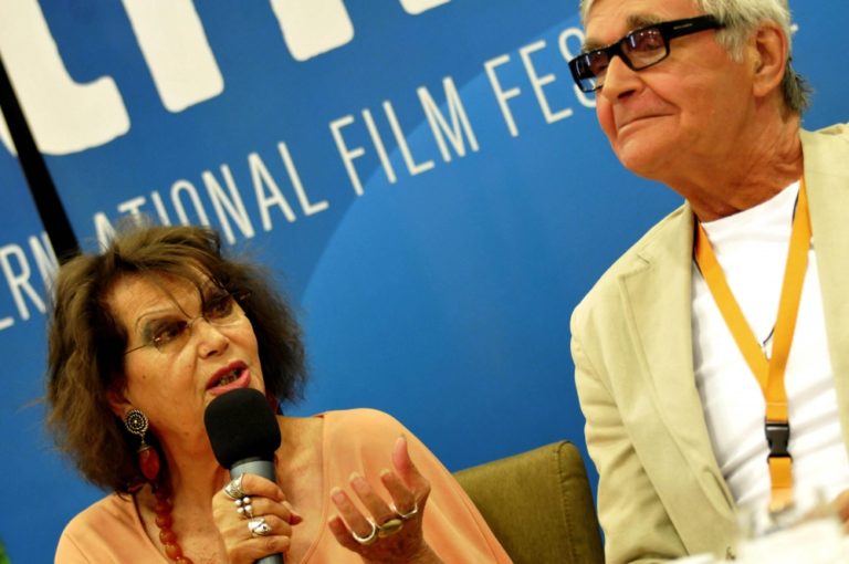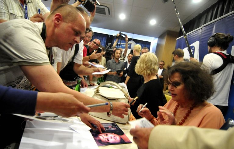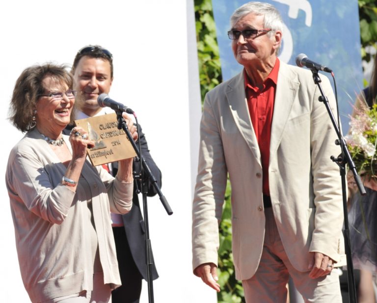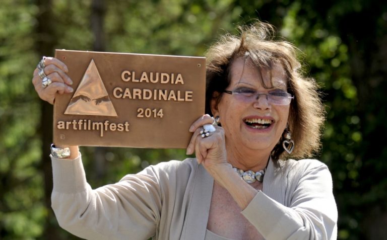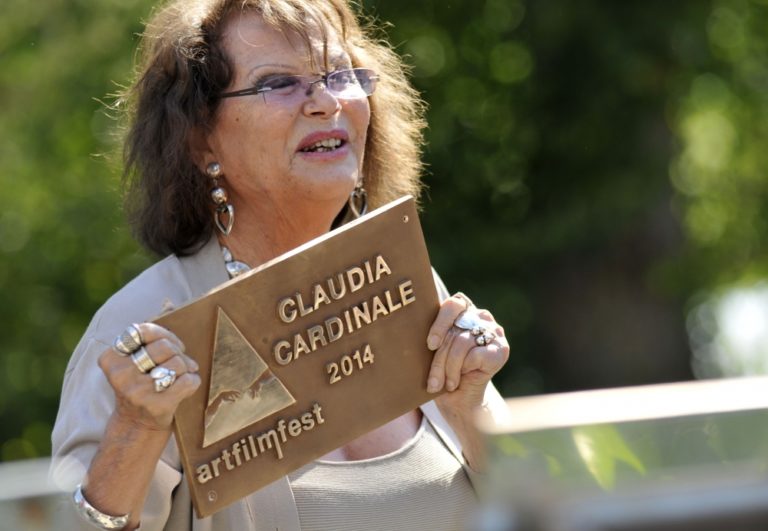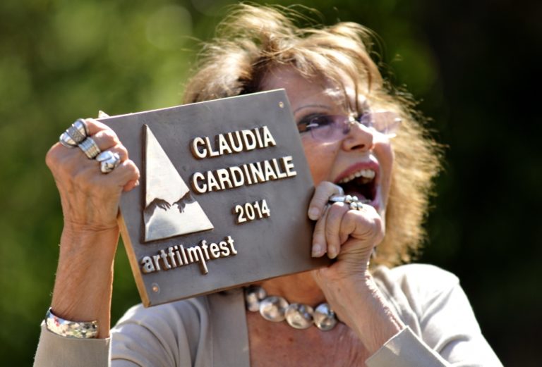 Talianska herečka Claudia Cardinale (uprostred) si prebrala cenu Hercova misia počas 22. ročníka medzinárodného filmového festivalu Art Film Fest 2014. Trenčianske Teplice, 22. jún 2014. Foto: SITA/Tomáš Somr