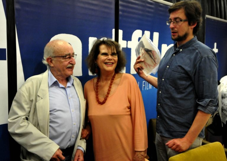 Zľava: Riaditeľ festivalu AFF Milan Lasica a talianska herečka Claudia Cardinale pri odovzdávaní ceny Hercova misia počas 22. ročníka medzinárodného filmového festivalu Art Film Fest 2014. Foto: SITA/Tomáš Somr