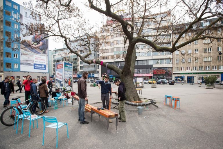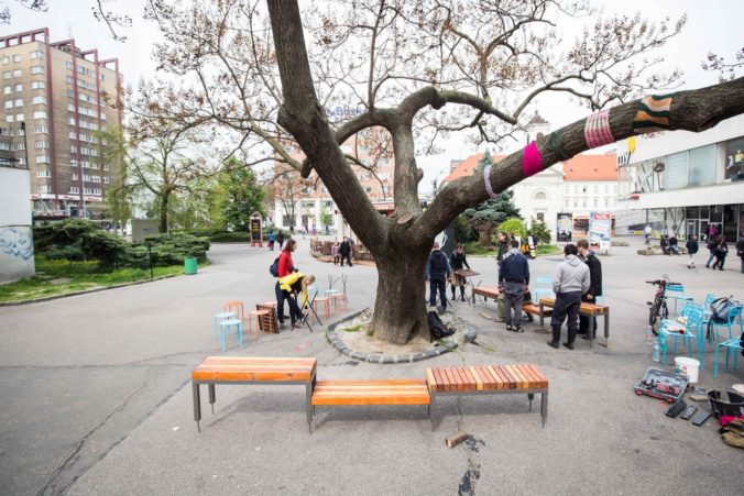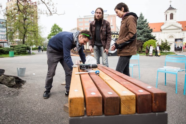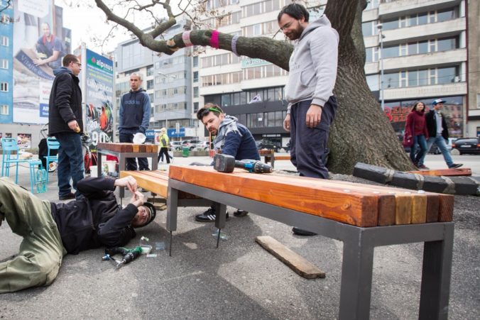 Členovia iniciatívy Námestie pre ľudí osádzajú prvú oficiálnu lavičku na Kamennom námestí. Foto: SITA/Jozef Jakubčo