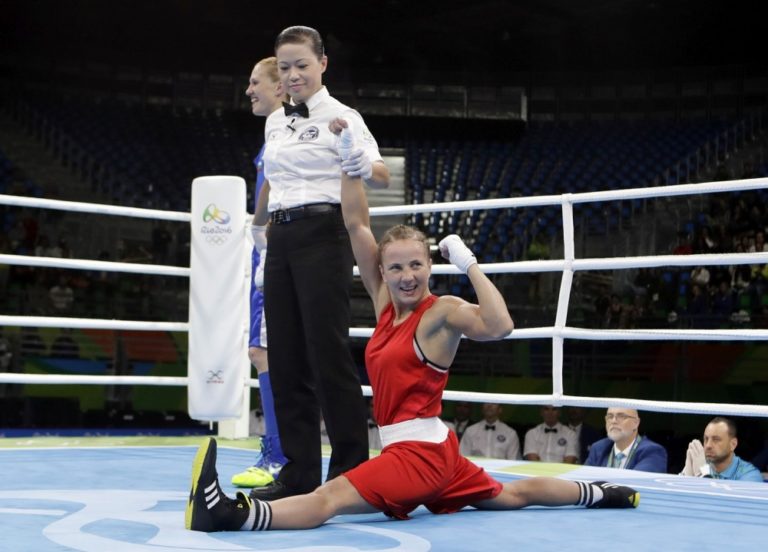 Ukrajinská boxeristka Tetyana Kobová sa raduje z triumfu nad Bulharkou Stanmirou Petrovovou v kategórii do 51 kg. Rio de Janeiro, 12. august 2016. Foto: SITA/AP