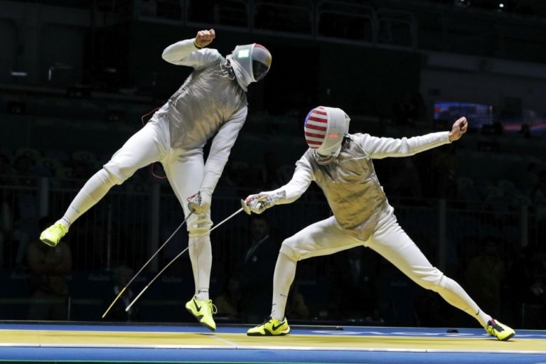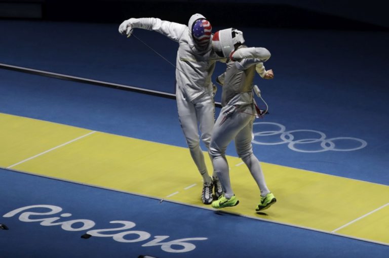 Egyptský reprezentant Alaaeldin Abouelkassem v súboji s Američanom Alexandrom Massialasom počas zápasu fleuret mužských družstiev. Rio de Janeiro, 12. august 2016. Foto: SITA/AP