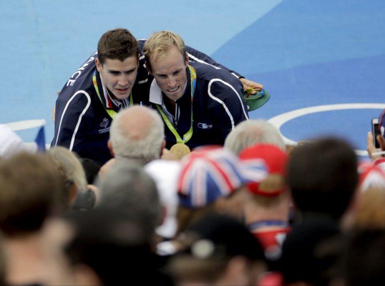 Francúzi Pierre Houin a Jérémie Azou získali zlato v dvojskife ľahkých váh. Rio de Janeiro, 12. august 2016. Foto: SITA/AP