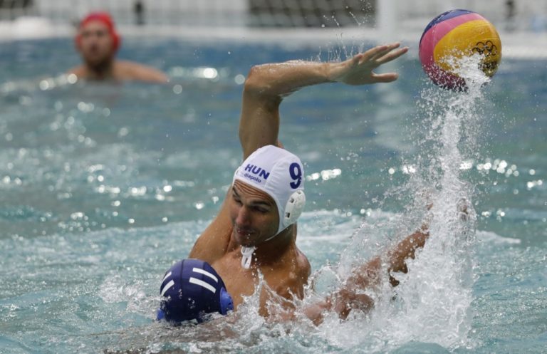 Japonský vodný pólista Keigo Okawa v súboji s Maďarom Danielom Vargom. Rio de Janeiro, 12. august 2016. Foto: SITA/AP