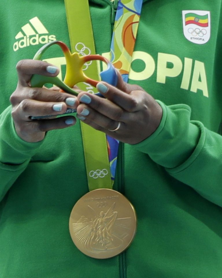 Etiópska vytrvalkyňa Almaz Ayanová na stupňoch víťazov po behu na 10 000 m, v ktorom zabehla nový svetový rekord a získala zlato. Rio de Janeiro, 12. august 2016 Foto: SITA/AP