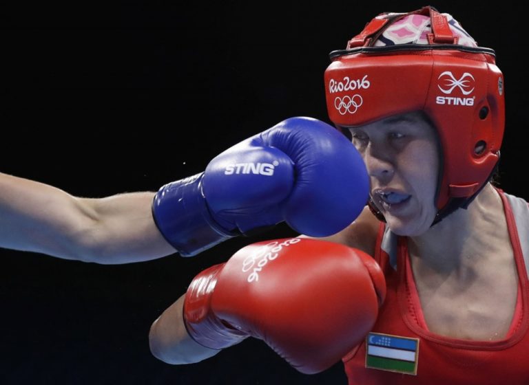Uzbekistanská boxeristka Yodgoroy Mirzaevovová počas zápas proti Kanaďanke Mandy Bujoldovej v kategórii do 51 kg. Rio de Janeiro, 12. august 2016. Foto: SITA/AP