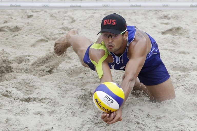 Ruský plážový volejbalista Viačeslav Krasilnikov počas zápasu olympijského turnaja. Rio de Janeiro, 12. august 2016. Foto: SITA/AP