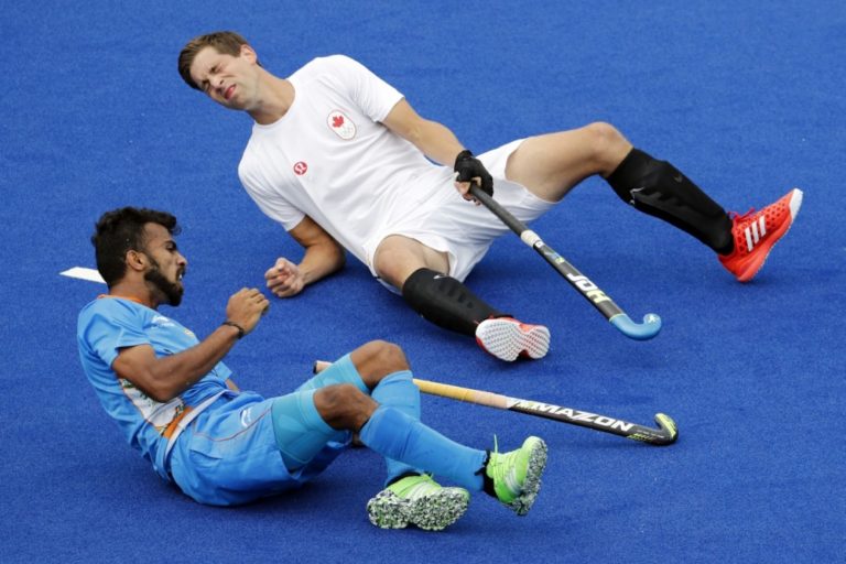 Indický reprezentant v pozemnom hokeji Chandanda Thimmaiah v súboji s Britom Iainom Smytheom. Rio de Janeiro, 12. august 2016. Foto: SITA/AP