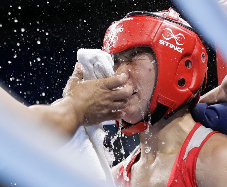 Tréner osviežuje uzbekistanskú boxeristku Yodgoroyu Mirzaevovovú počas jej zápas proti Kanaďanke Mandy Bujoldovej v kategórii do 51 kg. Rio de Janeiro, 12. august 2016. Foto: SITA/AP