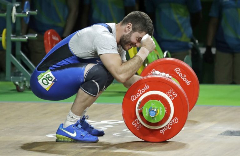Francúzsky vzpierač Giovanni Battista Bardis po úspešnom pokuse v kategórii do 85 kg. Rio de Janeiro, 12. august 2016. Foto: SITA/AP