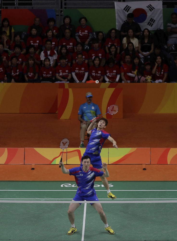 Bedmintonisti Južnej Kórei Lee Yong-dae (vzadu) a Yoo Yeong-seong počas zápasu olympijského turnaja. Rio de Janeiro, 12. august 2016. Foto: SITA/AP