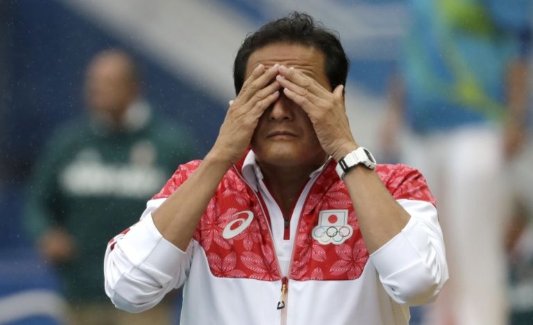 Japonský tréner vodnopólovej reprezentácie mužov Yoji Omoto počas zápasu proti Maďarsku. Rio de Janeiro, 12. august 2016. Foto: SITA/AP
