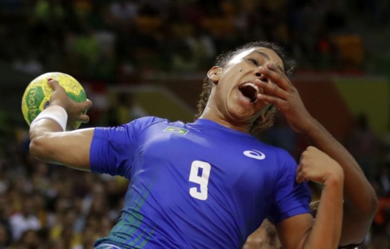 Hádzanárka Angoly Isabel Evelize W. Guialová chytila za tvár Brazílčanku Anu Paulu Belovú. Rio de Janeiro, 12. august 2016. Foto: SITA/AP