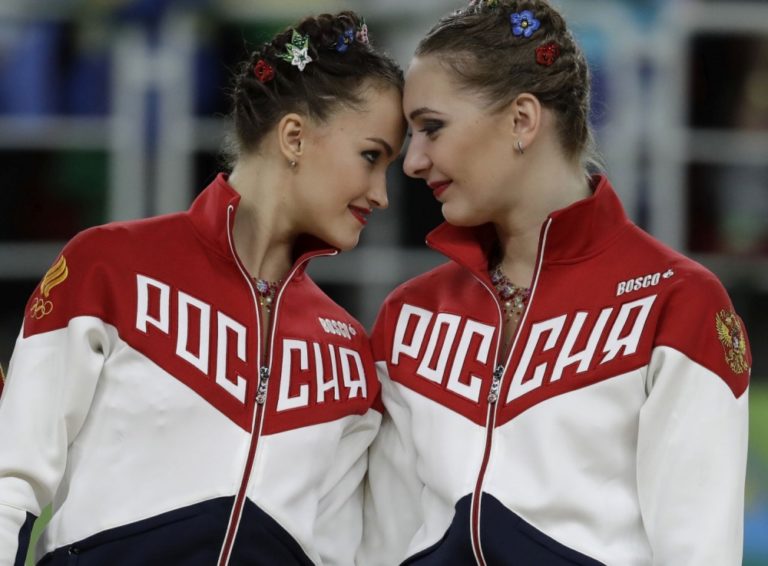 Členky tímu ruských moderných gymnastiek na stupňoch pre víťazov. Rio de Janeiro, 21. august 2016. Foto: SITA/AP