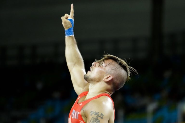 Americký zápasník Frank Aniello Molinaro sa raduje po finálovom zápase v kategórii do 65 kg, v ktorom zdolal Poliaka Magomedmurada Gadzhieva a získal zlatú medailu. Rio de Janeiro, 21. august 2016. Foto: SITA/AP