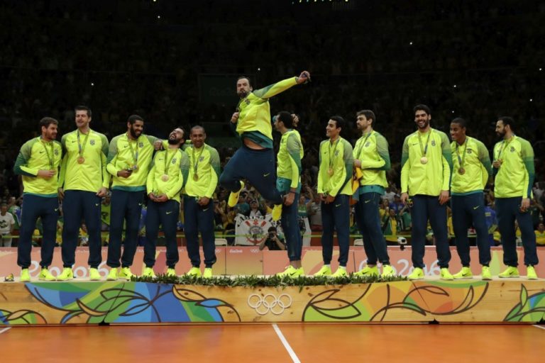 Radosť brazílskych volejbalistov na stupňoch pre víťazov po finálovom zápase, v ktorom zdolali Talianov. Rio de Janeiro, 21. august 2016. Foto: SITA/AP