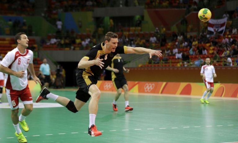 Nemecký reprezentant Tobias Reichmann strieľa gól Poliakom počas zápasu o tretie miesto. Rio de Janeiro, 21. august 2016. Foto: SITA/AP