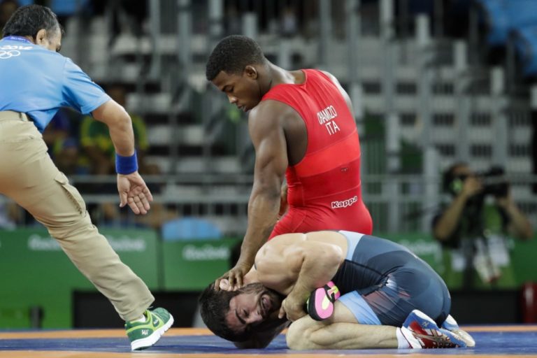 Taliansky zápasník Frank Chamizo Marquez v súboji so Zurabi Iakobishvilim z Gruzínska počas zápasu kategórie do 65 kg. Rio de Janeiro, 21. august 2016. Foto: SITA/AP