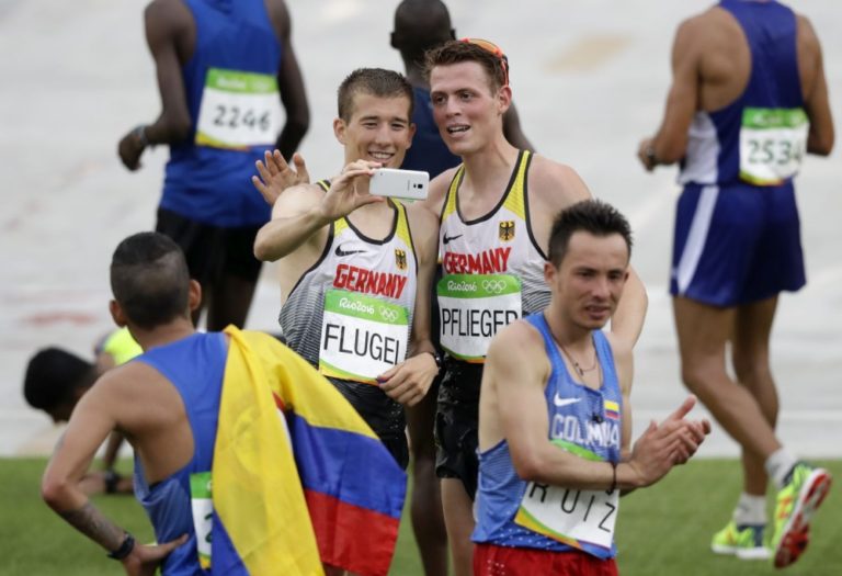 Nemeckí reprezentanti Julian Flugel a Philipp Pflieger si robia selfie po olympijskom maratóne. Rio de Janeiro, 21. august 2016. Foto: SITA/AP