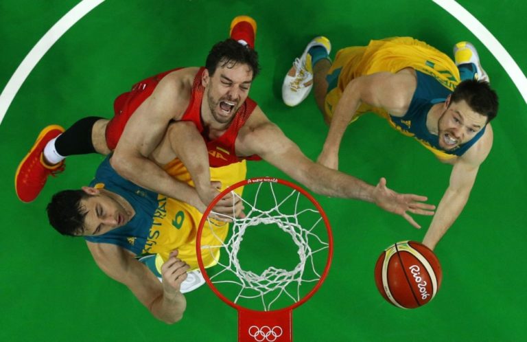 Austrálčania Andrew Bogut a Matthew Dellavedova v súboji so španielskym basketbalistom Pauom Gasolom počas zápasu o tretie miesto. Rio de Janeiro, 21. august 2016. Foto: SITA/AP