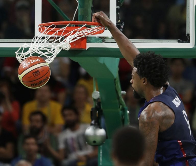 Efektný smeč amerického basketbalistu DeAndreho Jordana počas finálového zápasu proti Srbom. Rio de Janeiro, 21. august 2016. Foto: SITA/AP