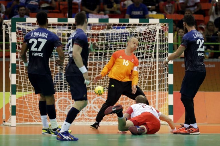 Dánsky hádzanár Henrik Toft Hansen prekonáva francúzskeho brankára počas finálového zápasu. Rio de Janeiro, 21. august 2016. Foto: SITA/AP
