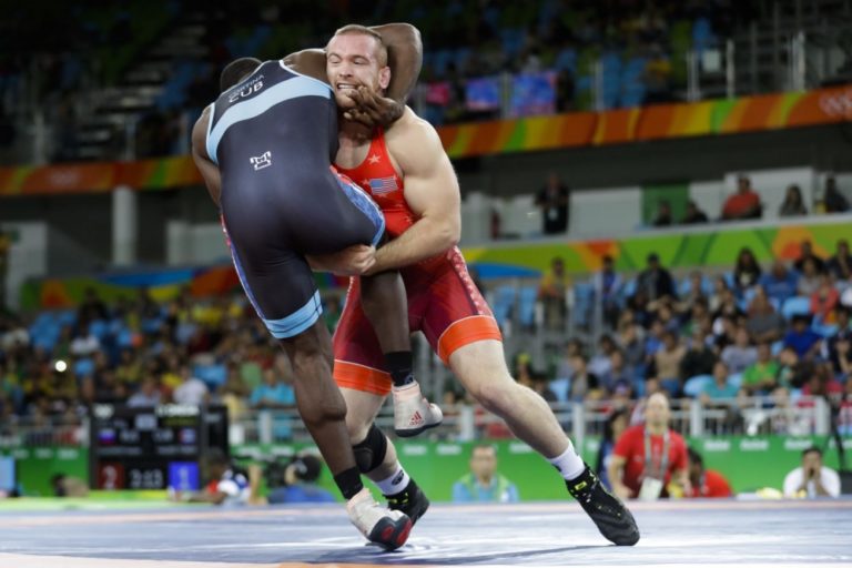 Americký zápasník Kyle Frederick Snyder v súboji s Kubáncom Javierom Cortinom Lacerrom vo finálovom zápase kategórie do 97 kg. Rio de Janeiro, 21. august 2016. Foto: SITA/AP