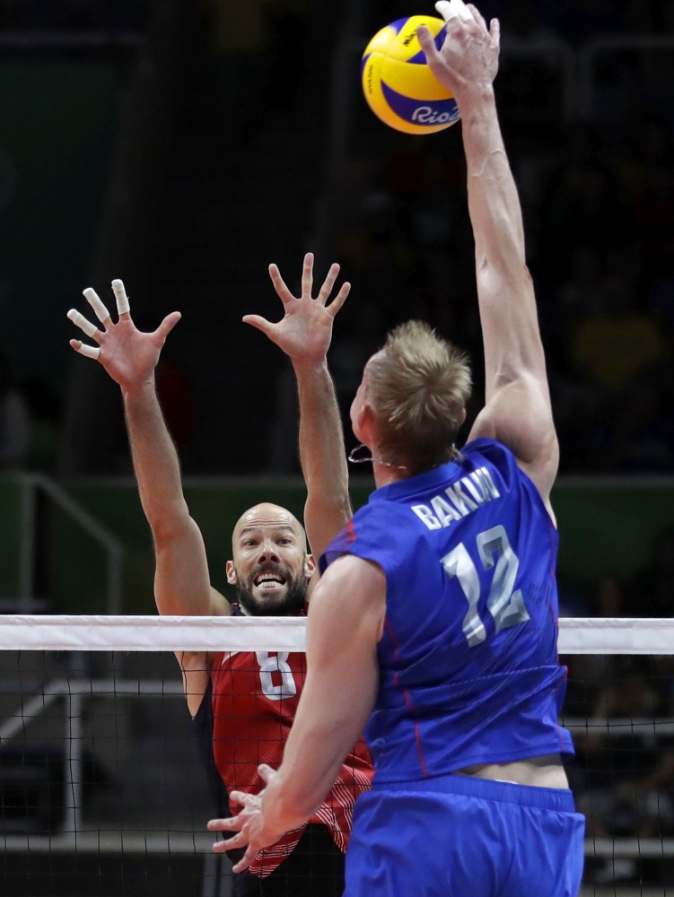 Americký volejbalista William Reid Priddy sa snaží zablokovať smeč Rusa Konstantina Bakuna počas zápasu o bronzové medaily. Rio de Janeiro, 21. august 2016. Foto: SITA/AP
