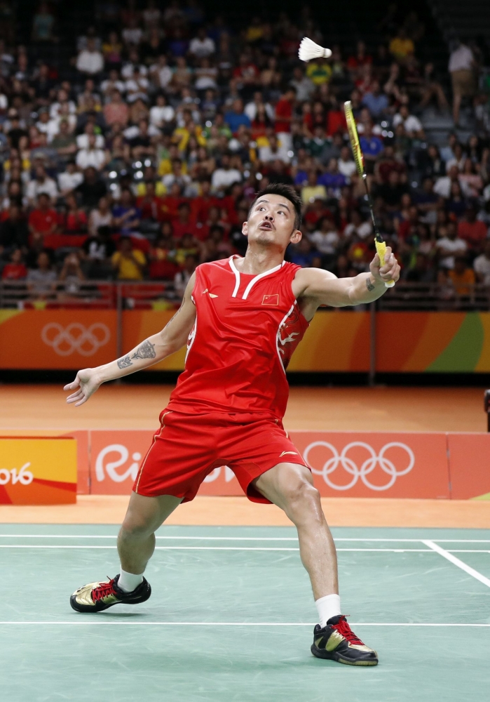 Čínsky bedmintonista Lin Dan počas zápasu o bronz proti Dánovi Viktorovi Axelsenovi. Rio de Janeiro, 20. august 2016. Foto: SITA/AP
